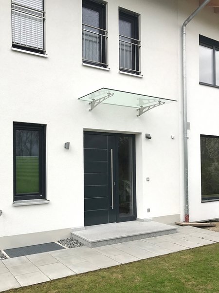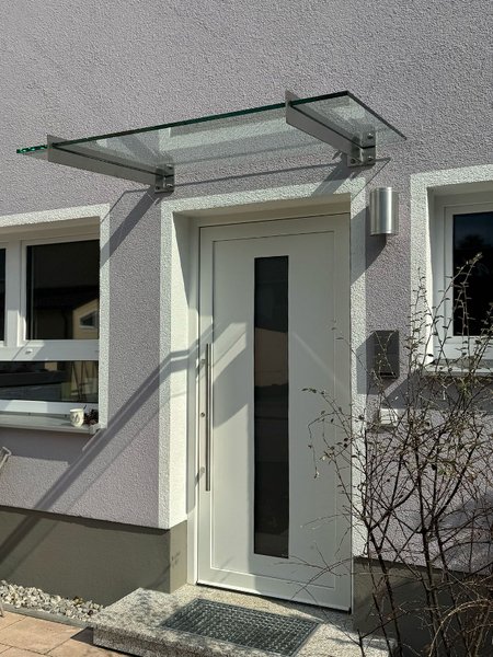 Wir passen unsere Lösungen aus Glas den besonderen Gegebenheiten Ihres Hauses an, wie z.B. eine abgehängtes Glasvordach oder eine Haustürüberdachung aus Mattglas.