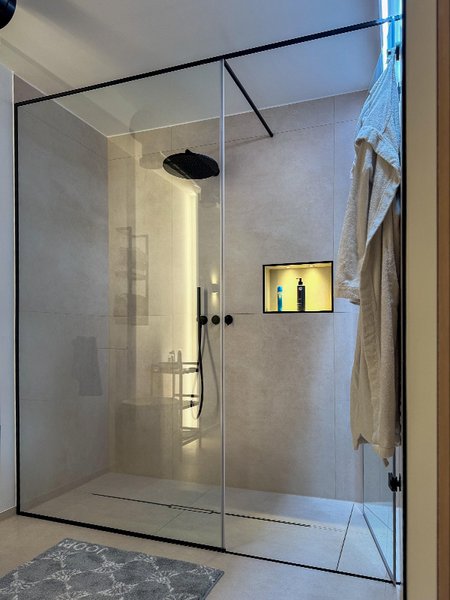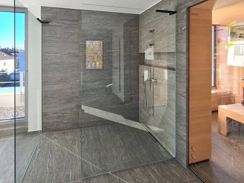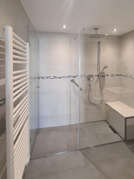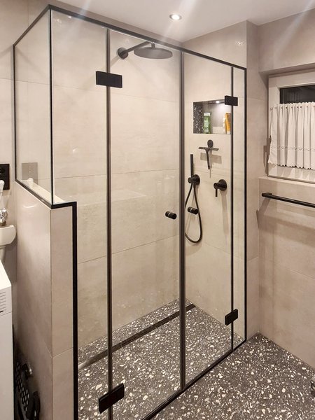 Eine Ganzglasdusche ist eine Duschkabine, bei der sowohl die Seitenwände als auch die Türen komplett aus Glas bestehen. Sie erzeugt eine transparente und offene Optik im Badezimmer.